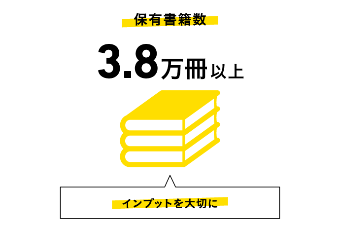 東京・大阪・佐賀の各拠点で、合計3.8万冊以上の書籍を保有しています。実用書からビジネス書、小説、マンガ、雑誌まで幅広いジャンルを揃えており、スタッフの知識や発想を広げるためのインプットに活用できます。