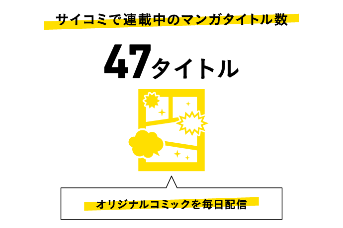 マンガでは、2016年5月からマンガ配信サービス「サイコミ」を展開。アクションやコメディー、ホラー、恋愛といった幅広いジャンルを取り揃え、『TSUYOSHI 誰も勝てない、アイツには』『ちくわ戦記~おれのカワイイで地球侵略~』『パーフェクトグリッター』など、47タイトルを連載中です。
