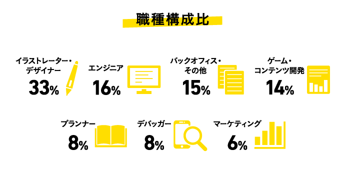 社内には、イラストレーターやデザイナー、エンジニア、バックオフィス系など、幅広い職種のスタッフが在籍しています。「常に「チーム・サイゲームス」の意識を忘れない」をミッションステートメントに掲げ、職種の枠を越えて協力し合うことで、業務のクオリティー向上や円滑化を図っています。