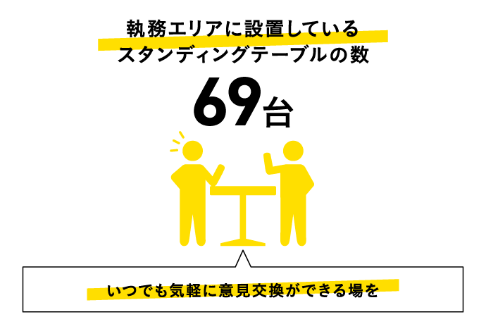 ちょっとした意見交換や打ち合わせの場として、執務エリアにスタンディングテーブルを設置しています。気軽にコミュニケーションを取れるため、業務の進行や判断をスムーズにすることにも役立っています。