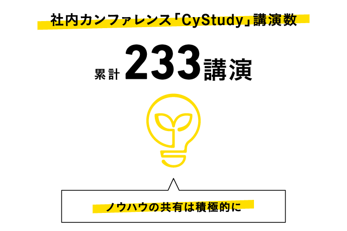「プロジェクトに埋もれている知見や情報を共有するための場所」として、公募制の社内向けカンファレンス「CyStudy(サイスタディ)」も開催しています。ゲーム開発や生成AI活用、アニメ事業、採用戦略など幅広いテーマでこれまでに233本の講演を実施。社内における重要な知見共有の機会となっています。