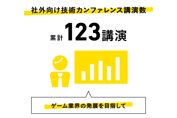 業界全体の発展に寄与するために、外部講演にも積極的に取り組んでいます。毎年夏に開催されるゲーム業界の技術交流会「CEDEC」への登壇や、自社単独で開催する技術カンファレンス「Cygames Tech Conference」を通じて、これまでにゲーム開発の知見を広く発信してきました。講演内容はAI技術やゲームデザイン、映像制作、サウンド、コンテンツマーケティングなど多岐にわたり、現場の最前線で培ったノウハウを業界全体に共有しています。