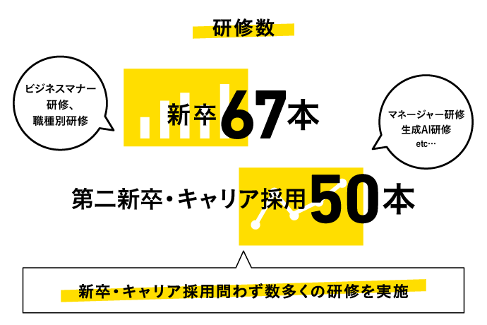 「社員が日々発信するあらゆるものが、サイゲームスのブランドを形成していく」という考えのもと、新卒・キャリア採用を問わず多くの研修を用意しています。新卒向けには職種別研修の他、情報セキュリティやビジネスマナーなどの基礎研修を含めた67本の研修を用意。キャリア採用向けには、経験者・リーダー層を対象としたマネージャー研修やメンタートレーナー向けの研修など、50本の研修を用意しています。