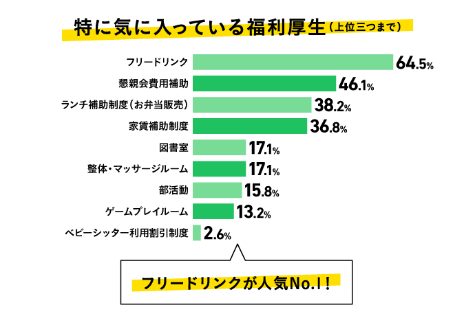 サイゲームスには、働きやすさを支える充実の福利厚生があります。特に気に入っている人が多い福利厚生は、1位が「フリードリンク」、2位が「懇親会費用補助」、3位が「ランチ補助制度」でした。毎日気軽に利用できるものが人気を集めています。