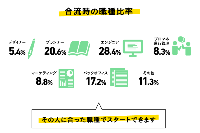 合流時に二卒が就く職種は多岐にわたります。最も多いのはエンジニア、次いでプランナーでした。その他にも、プロモーションやメディアプランナーなどのマーケティング職、プロジェクトマネージャー、デザイナーなど様々な職種からゲーム業界のキャリアをスタートした二卒がいます。あなたの得意分野が活かせる場所が必ずあるので、面接で聞かせてください!