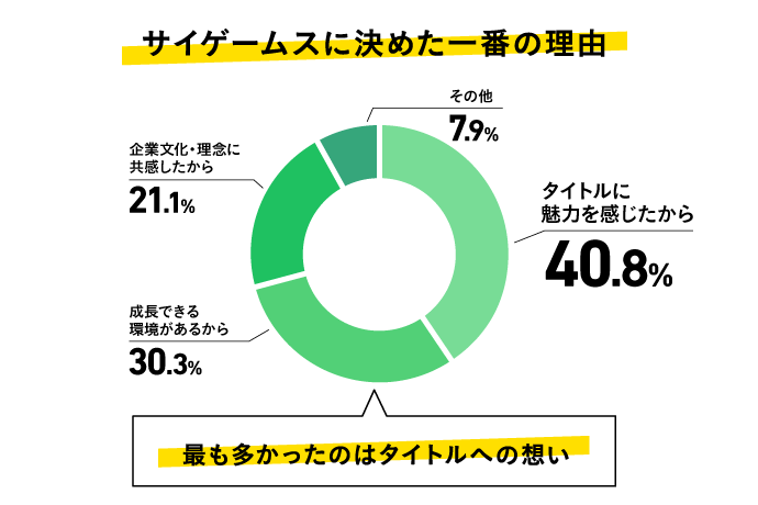 サイゲームスに合流することを決めた一番の理由として、最も多かった回答は「タイトルに魅力を感じたから」でした。続いて「成長できる環境があるから」という結果に。自身の情熱や成長意欲を重視して合流を決めていることがわかります。