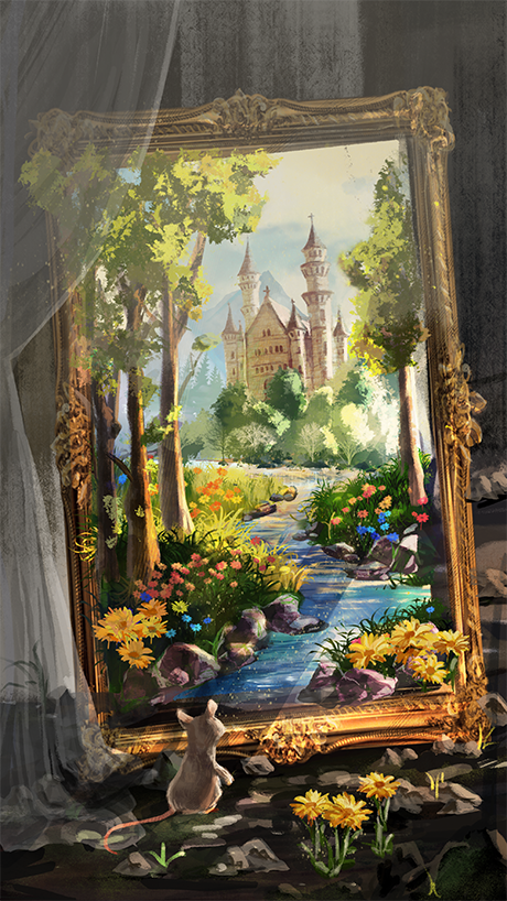 懐かしさと童話的な空気を基調に、廃れた遺跡の中から古い絵画の雰囲気が外へ広がっていく様子を描いています。