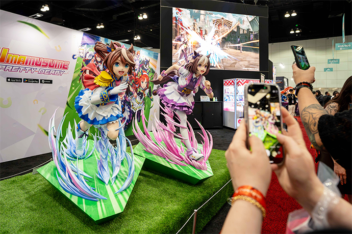 在“Anime Expo”的 Cygames 展区中,首次展示了《赛马娘》中登场角色——特别周与东海帝王的等身大手办,并提供了《影之诗WB》与《Granblue Fantasy Versus: Rising》(以下简称《GBVSR》)的试玩。此外,还设有贩售各作品周边商品的物贩区,以及能抓取《赛马娘》纪念品的夹娃娃机,以丰富的内容迎接到访者。