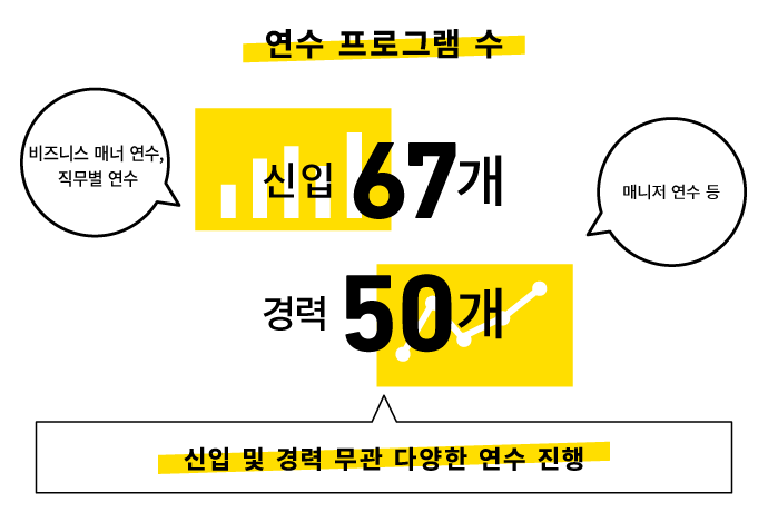 직원이 매일 제공하는 모든 것들이 사이게임즈의 브랜드 가치를 결정한다는 생각 아래 신입 사원과 경력 사원 모두를 대상으로 한 다양한 연수 프로그램을 마련하고 있습니다. 신입 사원 대상으로는 직무별 연수 외에도 정보 보안, 비즈니스 매너 등 기초 연수를 포함한 총 67개의 프로그램이 준비되어 있으며, 경력 사원을 위해서는 경력자와 리더층을 대상으로 한 매니저 연수, 멘토 트레이너 연수 등 50개의 프로그램이 마련되어 있습니다.