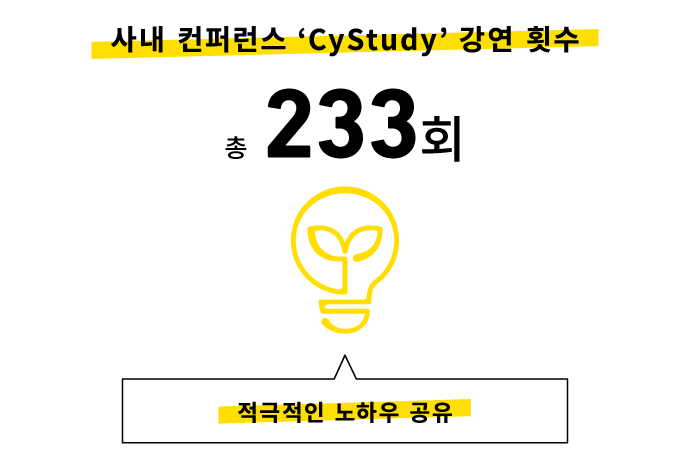 또한, ‘프로젝트에 묻힌 지식과 정보를 공유하는 장소’로서 사내 공모제 컨퍼런스 ‘CyStudy(사이스터디)’도 개최하고 있습니다. 게임 개발, 생성형 AI 활용, 애니메이션 사업, 채용 전략 등 다양한 주제로 지금까지 233회의 강연을 진행해, 사내에서 중요한 지식 공유의 기회로 자리매김하고 있습니다.