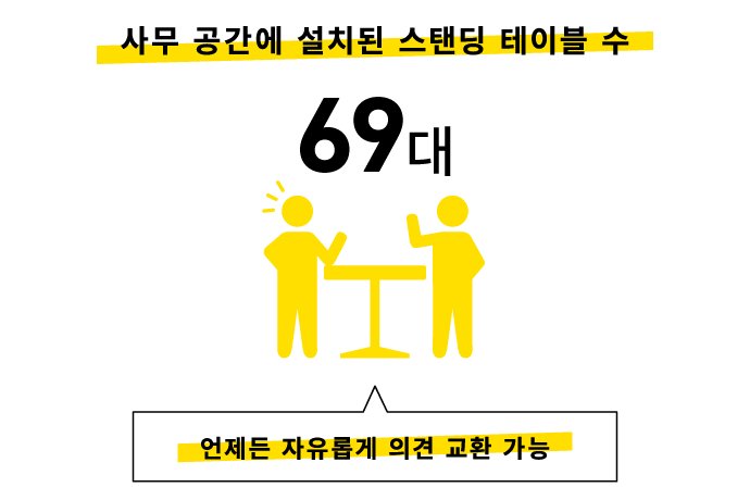 간단한 의견 교환이나 미팅을 위한 공간으로 사무 공간에 스탠딩 테이블이 설치되어 있습니다. 언제든 편하게 소통에 이용할 수 있어, 업무 진행과 의사 결정을 원활하게 하는 데 도움이 되고 있습니다.