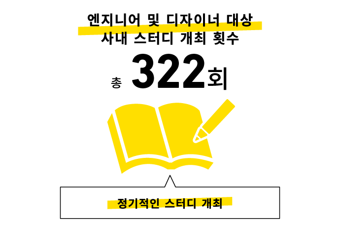사내에서는 스터디가 활발하게 이루어지고 있습니다. 대표적인 예로는 2015년부터 이어져 온 엔지니어 대상 ‘스킬 서즈데이’와 2019년에 시작된 디자이너 대상 ‘디자이너즈 토크’가 있습니다. 두 스터디 모두 직무와 상관없이 모든 스태프가 참여할 수 있어, 부서와 직무를 넘나드는 지식 공유의 장이 되고 있습니다.