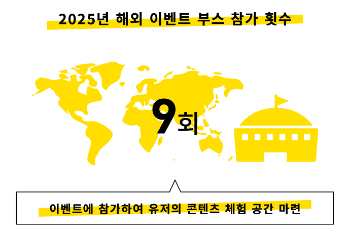 해외 유저 여러분과 직접 소통하기 위해 세계 각지의 이벤트에 부스를 내 참가하고 있습니다. 2025년에는 대만 최대 게임 이벤트 ‘타이베이 게임쇼’, 북미 최대급 애니메이션 컨벤션 ‘Anime Expo’를 비롯해 총 9개의 이벤트에 참가했습니다. 앞으로도 ‘최고의 콘텐츠’를 전 세계에 제공하기 위해 각 지역의 문화와 요구에 부응하는 노력을 이어 가겠습니다.