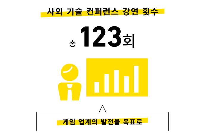 업계 전체의 발전에 기여하기 위해 외부 강연에도 적극적으로 참여하고 있습니다. 매년 여름 개최되는 게임 업계 기술 교류회 ‘CEDEC’이나, 사이게임즈 단독으로 개최하는 기술 컨퍼런스 ‘Cygames Tech Conference’를 통해 지금까지 게임 개발에 관한 다양한 지식을 전달해 왔습니다. 강연 주제는 AI 기술, 게임 디자인, 영상 제작, 사운드, 콘텐츠 마케팅 등 다방면에 걸쳐 있으며, 현장의 최전선에서 축적한 노하우를 업계 전반에 공유하고 있습니다.