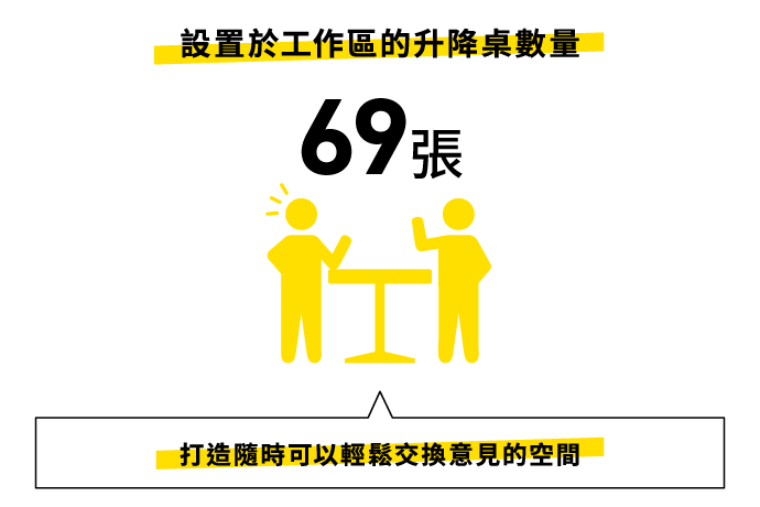 工作區有設置升降桌,當作是簡單交換意見或進行會議的空間。因為能輕鬆地和彼此溝通,所以也有助於讓業務的流程及決定進行得更順利。