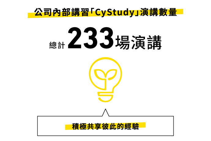 公司也有舉辦公開徵選制的公司內部講習「CyStudy」,當作是「為了共享埋沒在專案內的知識、經驗及資訊而存在的場所」。至今已舉辦了 233 場演講,涵蓋各式各樣廣泛的主題,比如說遊戲開發、生成式 AI 應用、動畫事業、錄取策略等等,在公司內已成為共享知識、經驗的珍貴機會。